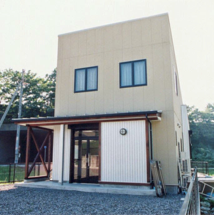 田んぼの真中に建つ片流れ屋根の住宅です。少ない面積の中で狭さを感じさせないような空間の広がりを確保するように考えました。