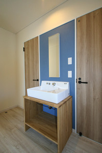 木製カウンターの上にオーバーカウンタータイプの洗面器が取り付けられていて、カウンター下にはタオル掛け用のステンレス製バーがついています。正面の壁はブルーのアクセントカラーとしています。
